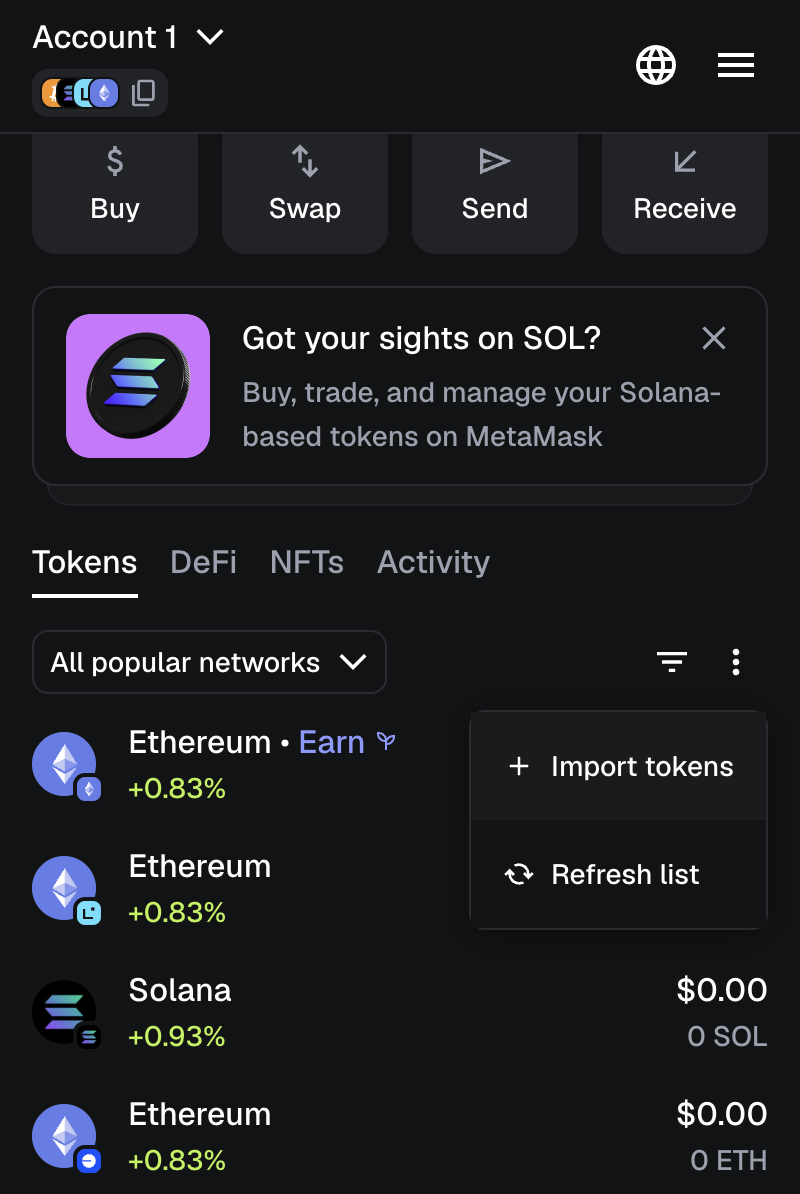 Import tokens by adding the smart contract to your wallet. For that, in your MetaMask wallet, go to the Tokens tab and click Import tokens.