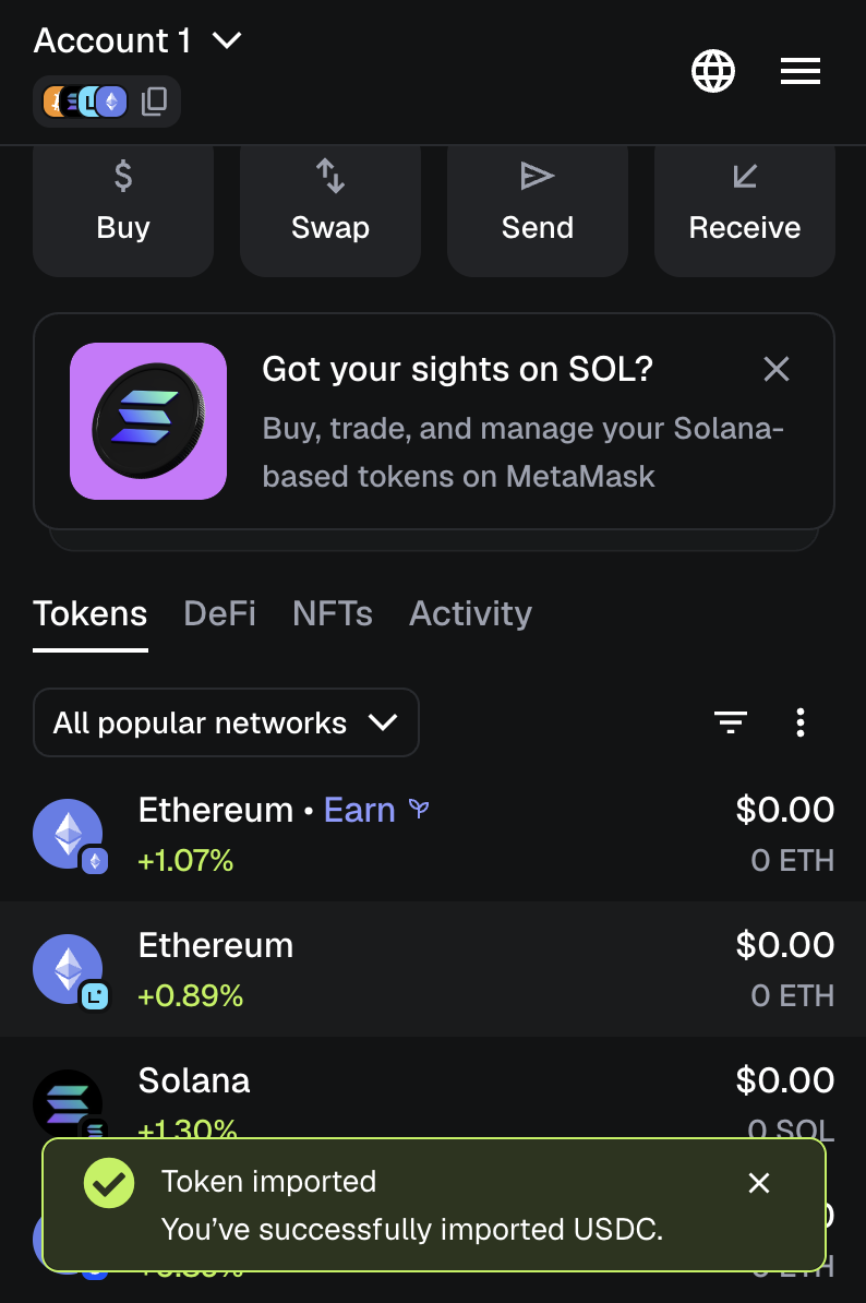 USDC ETHEREUM is now added to your wallet, and you can complete USDC transactions once you have received test funds.